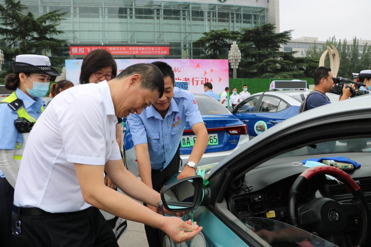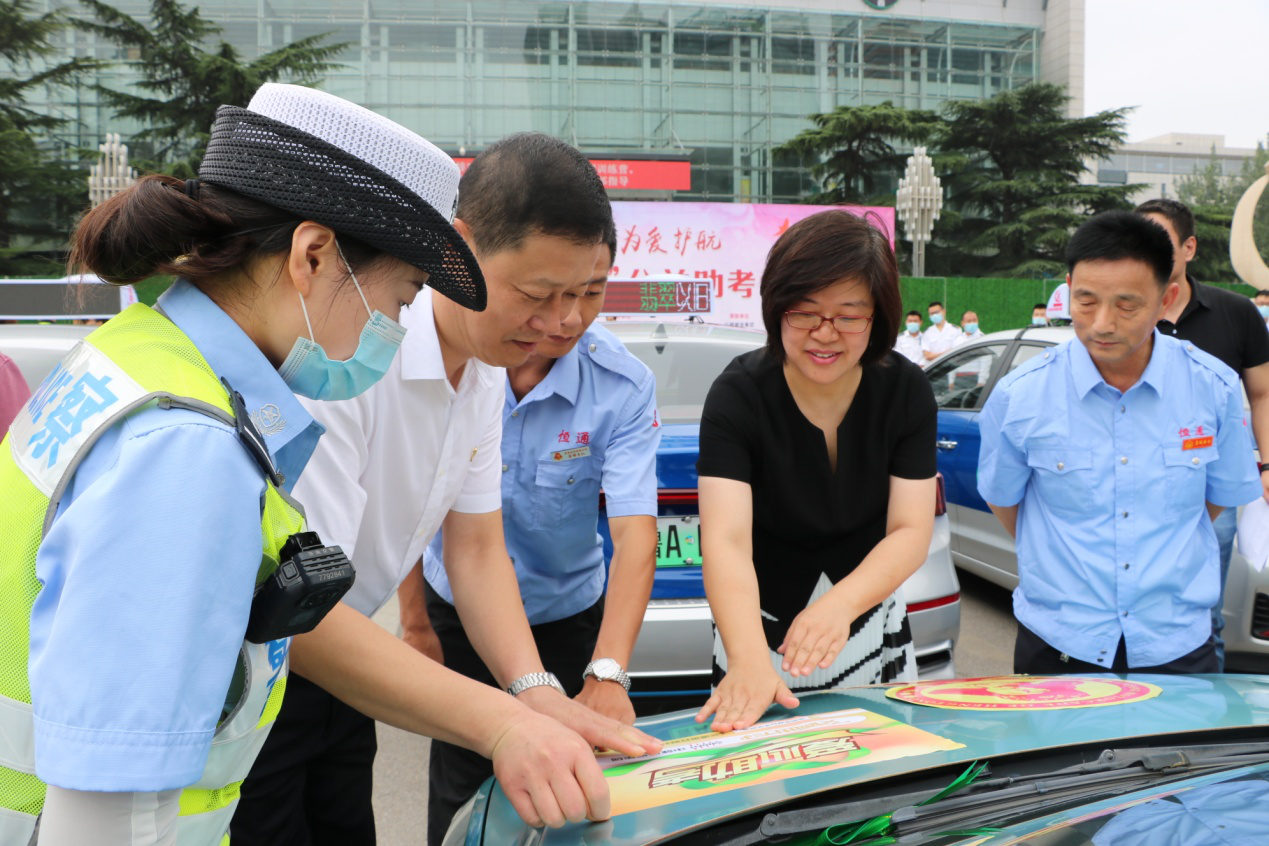 此次助考活動(dòng),舉辦方還為愛(ài)心助考車(chē)輛準(zhǔn)備了愛(ài)心助考貼和綠絲帶標(biāo)識(shí)。李培鋼董事長(zhǎng)與濟(jì)南廣播電視臺(tái)黨委委員、副臺(tái)長(zhǎng)許偉、濟(jì)南市公安局交警支隊(duì)副支隊(duì)長(zhǎng)趙洪銘等領(lǐng)導(dǎo)一同來(lái)到送考車(chē)輛前,為助考車(chē)輛貼上了愛(ài)心助考貼、綁上綠絲帶,標(biāo)志著愛(ài)心助考活動(dòng)正式啟動(dòng)。